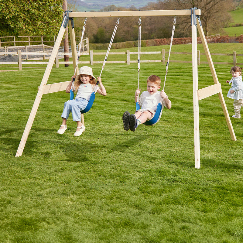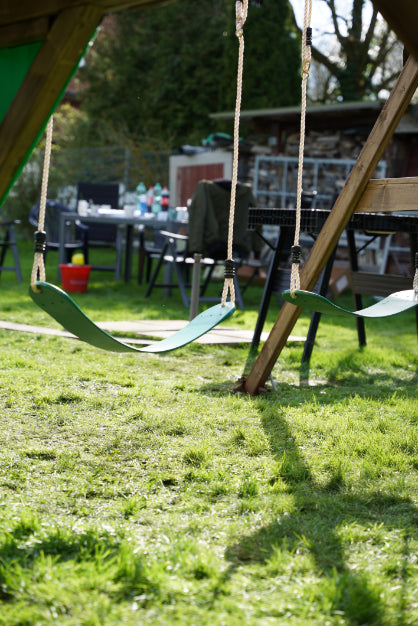 - Bois : Une balançoire individuelle en bois est, avec un entretien soigné, une structure extrêmement durable et stable qui s'intègre parfaitement dans l'environnement du jardin grâce à son aspect organique. Vous pouvez également la personnaliser avec une peinture individuelle.