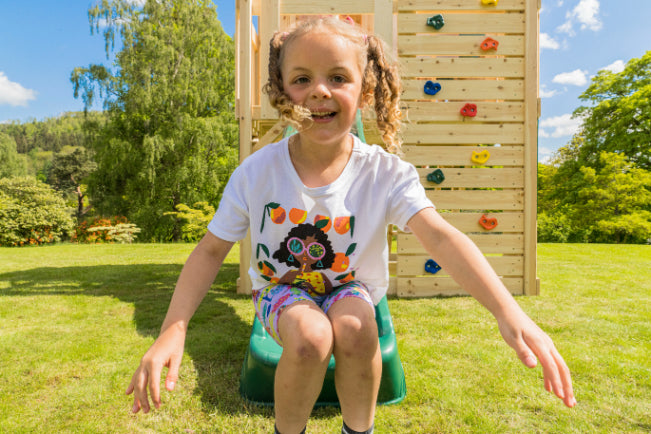 Astuce: Avec un tuyau d'arrosage, vous transformez le toboggan en toboggan aquatique en été.