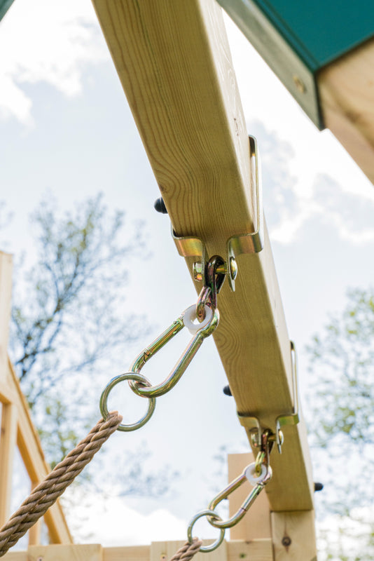 Utilisez uniquement du matériel (crochets, cordes, mousquetons) pour fixer la balançoire qui correspond aux spécifications du siège de la balançoire, du support et bien sûr de la charge. La structure de la balançoire elle-même doit être solidement ancrée dans le sol et maintenir la distance nécessaire par rapport aux obstacles (2 mètres plus la longueur de la corde) et éventuellement à la balançoire voisine (au moins 70 cm).