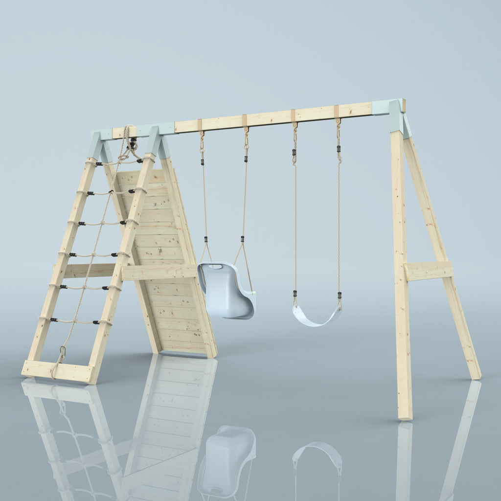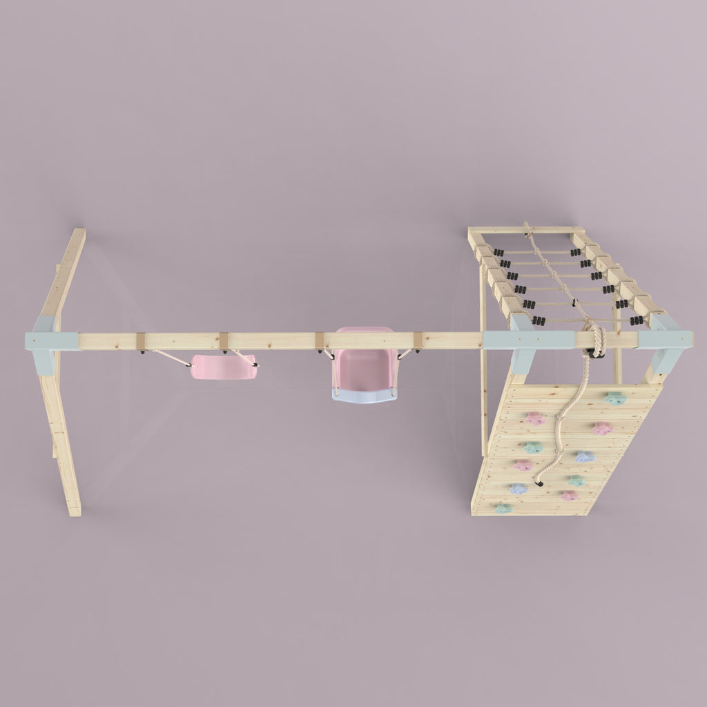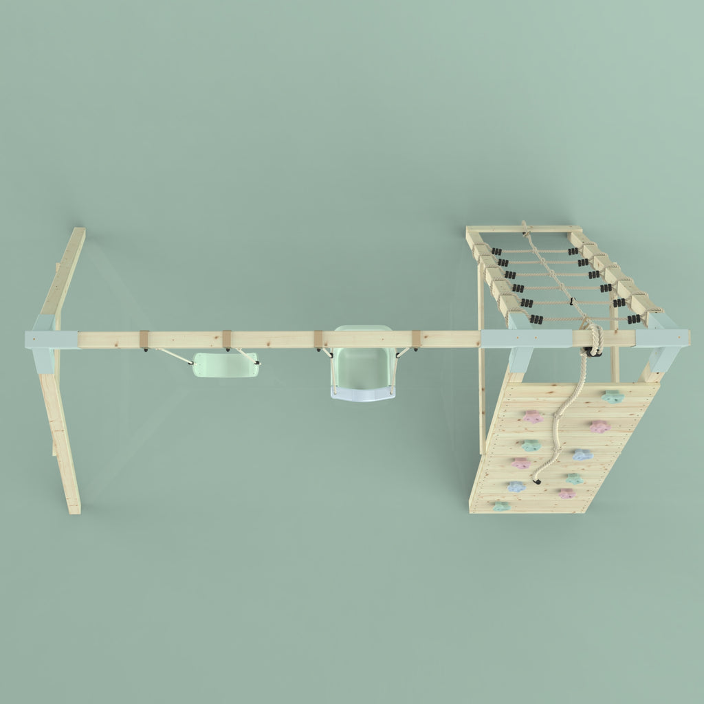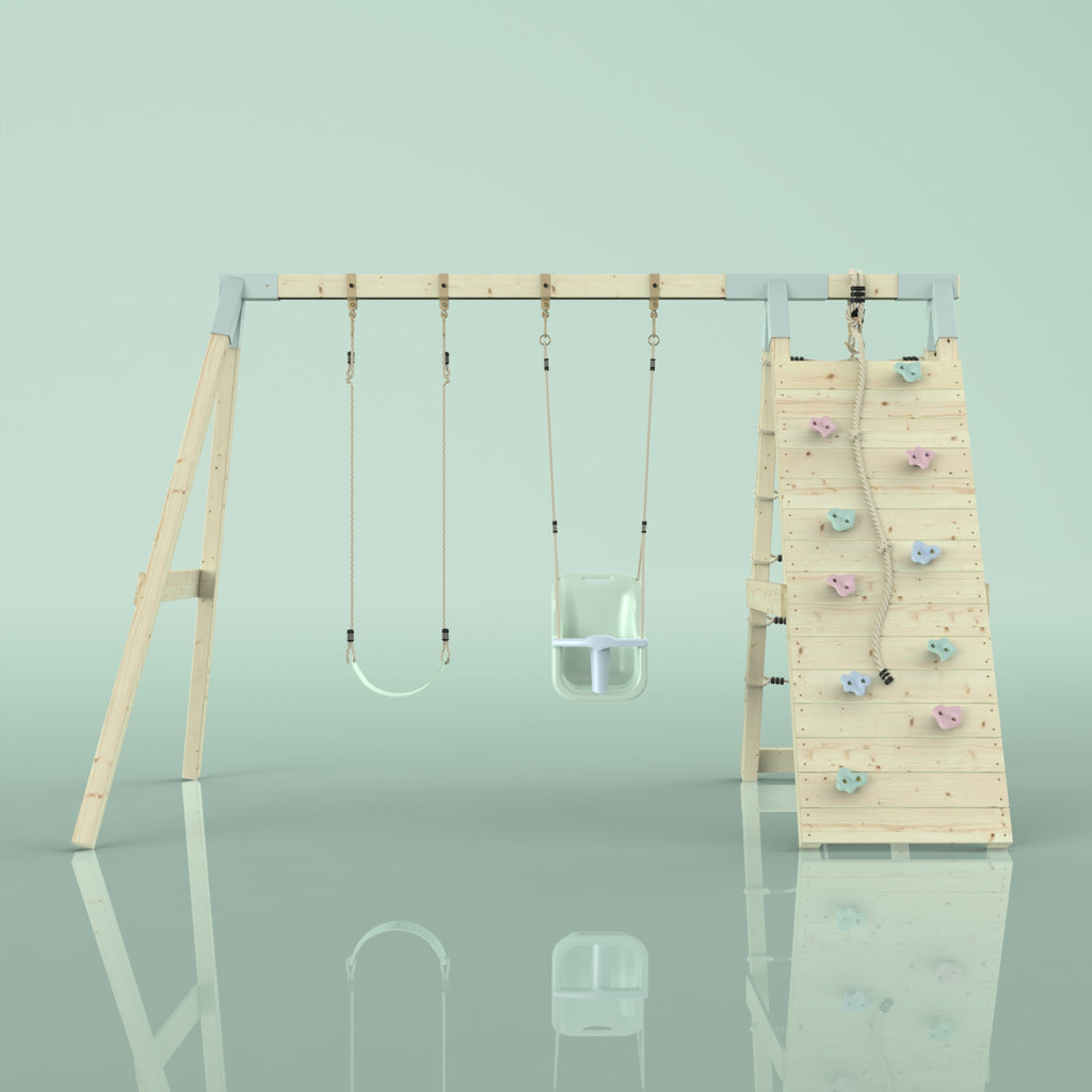 Notre portique à grimper PolarPlay Coucou est particulièrement adaptée aux frères et sœurs qui aiment plonger ensemble dans leur imagination. En plus des deux sièges de balançoire, tes enfants peuvent se défouler pendant des heures sur le mur d'escalade et les filets à grimper.